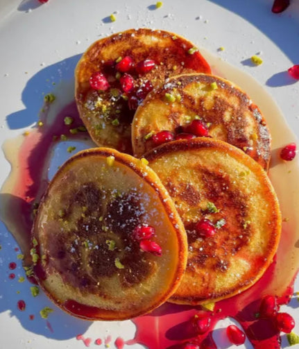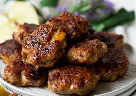 Pumpkin Cranberry Protein Pancakes (2) with Homemade Apple Chicken Sausage (GF) (can sub fruit for vegetarian)