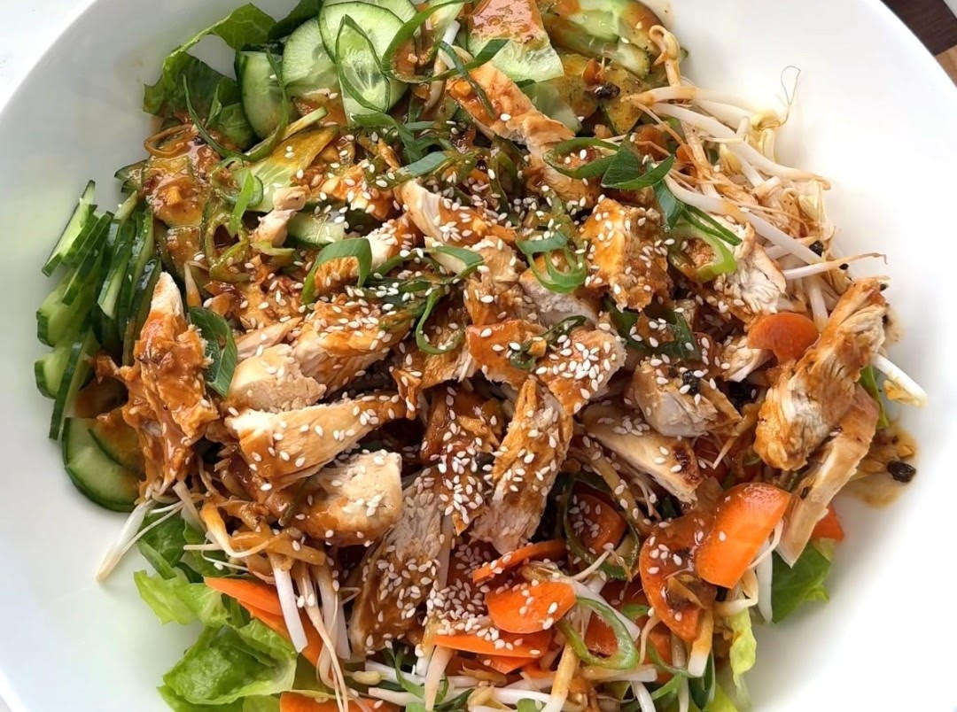 Bang Bang Chicken Salad with Sweet & Spicy Peanut Dressing & Fresh Veggies (GF)