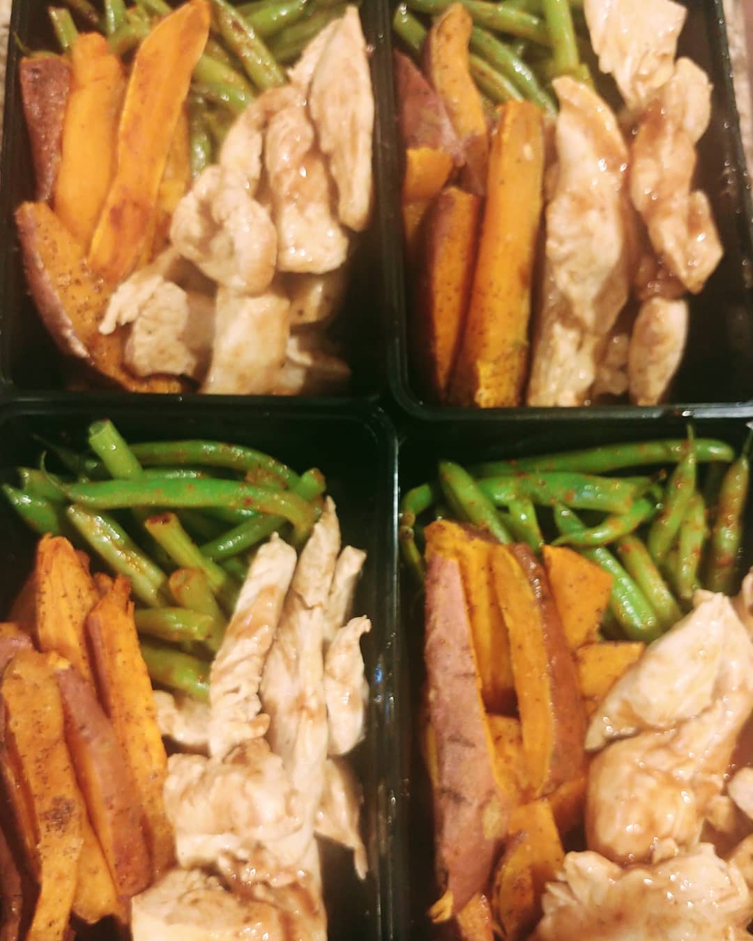 Ingredients: Chicken breast, sweet potatoes, green beans, olive oil, pink salt, black pepper, onions, seasonings.