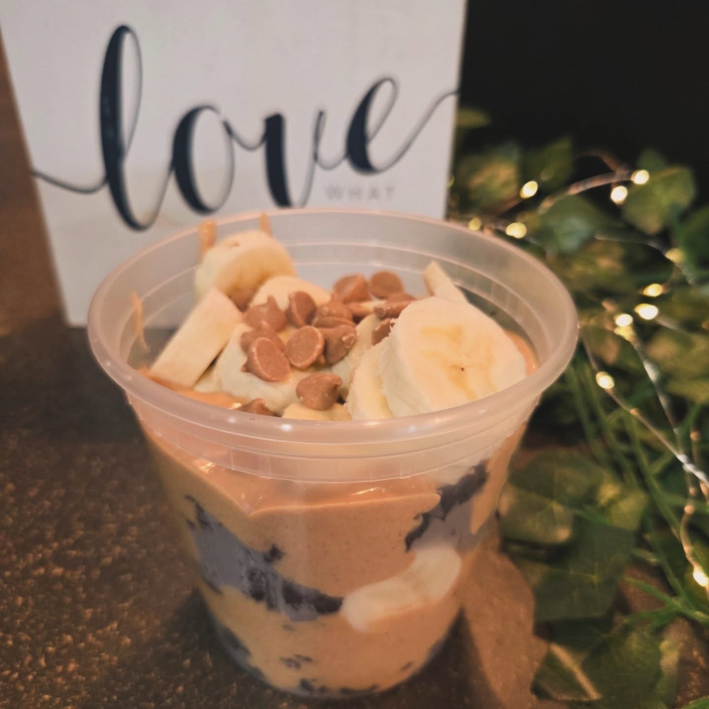 Unit price perThis Guilt free dessert is layered with our own chocolate protein brownie, peanut better protein whip, bananas, and topped with peanut butter chips! Full of protein, and with no added sugars, this is one of our customer favorites!